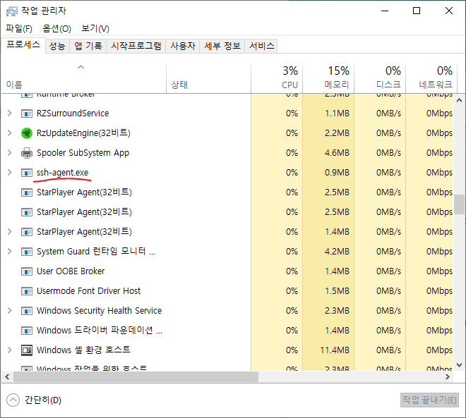 - 프로세스 탭에서 아래로 스크롤하다 보면 아래 사진과 같이 ssh.exe 또는 ssh-agent.exe 또는 GitExtensions.exe가 있습니다. 우클릭 > 작업 끝내기 해줍니다.