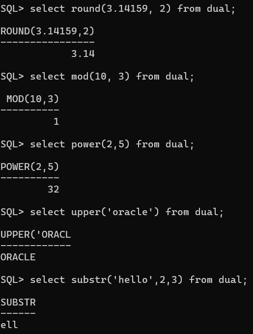 | ✅ 반올림 | SELECT ROUND(3.14159, 2); | SELECT ROUND(3.14159, 2) FROM DUAL; | 동일 |