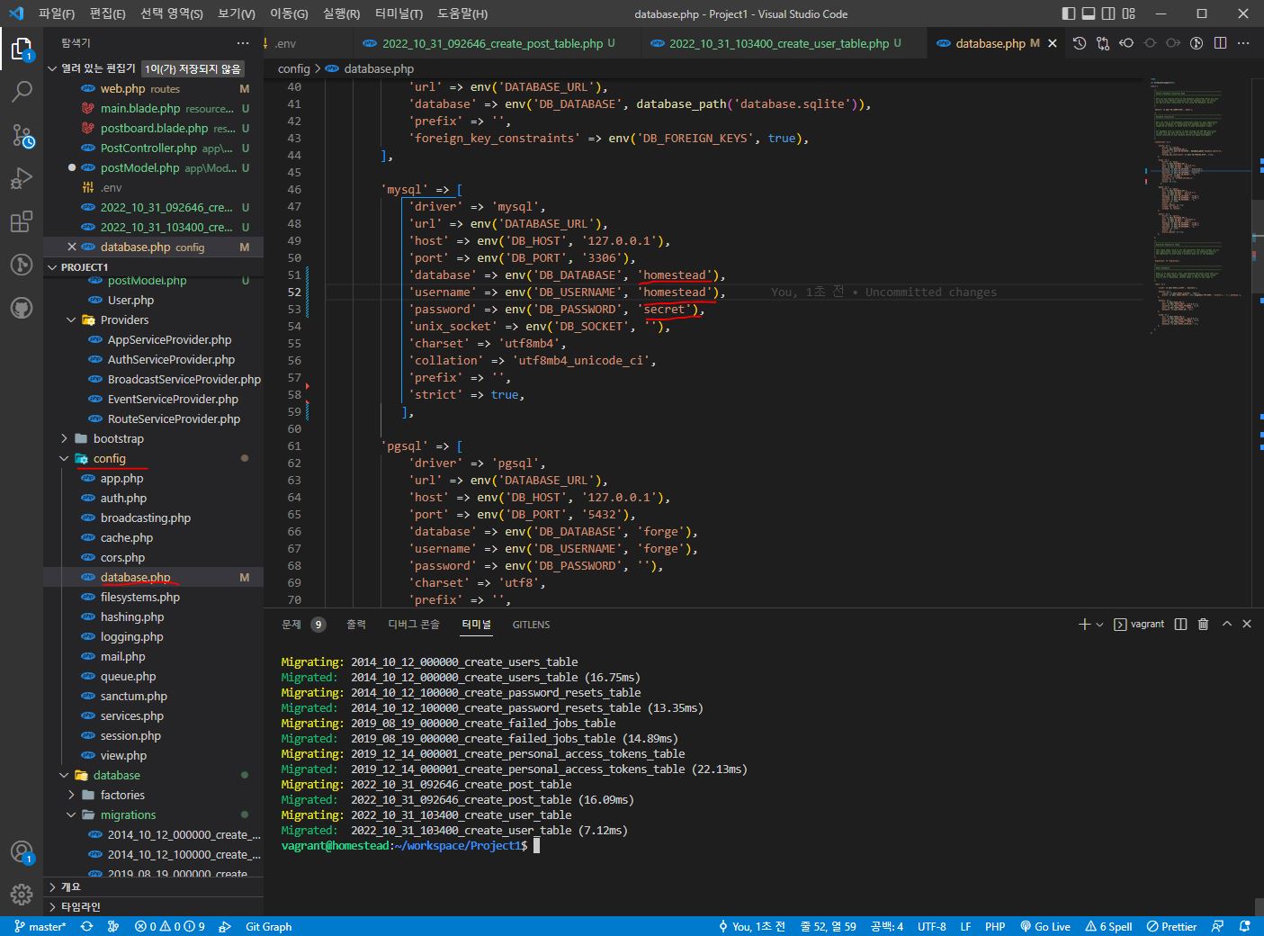 database.php도 마찬가지로 51행~53행을 다시 설정하고,