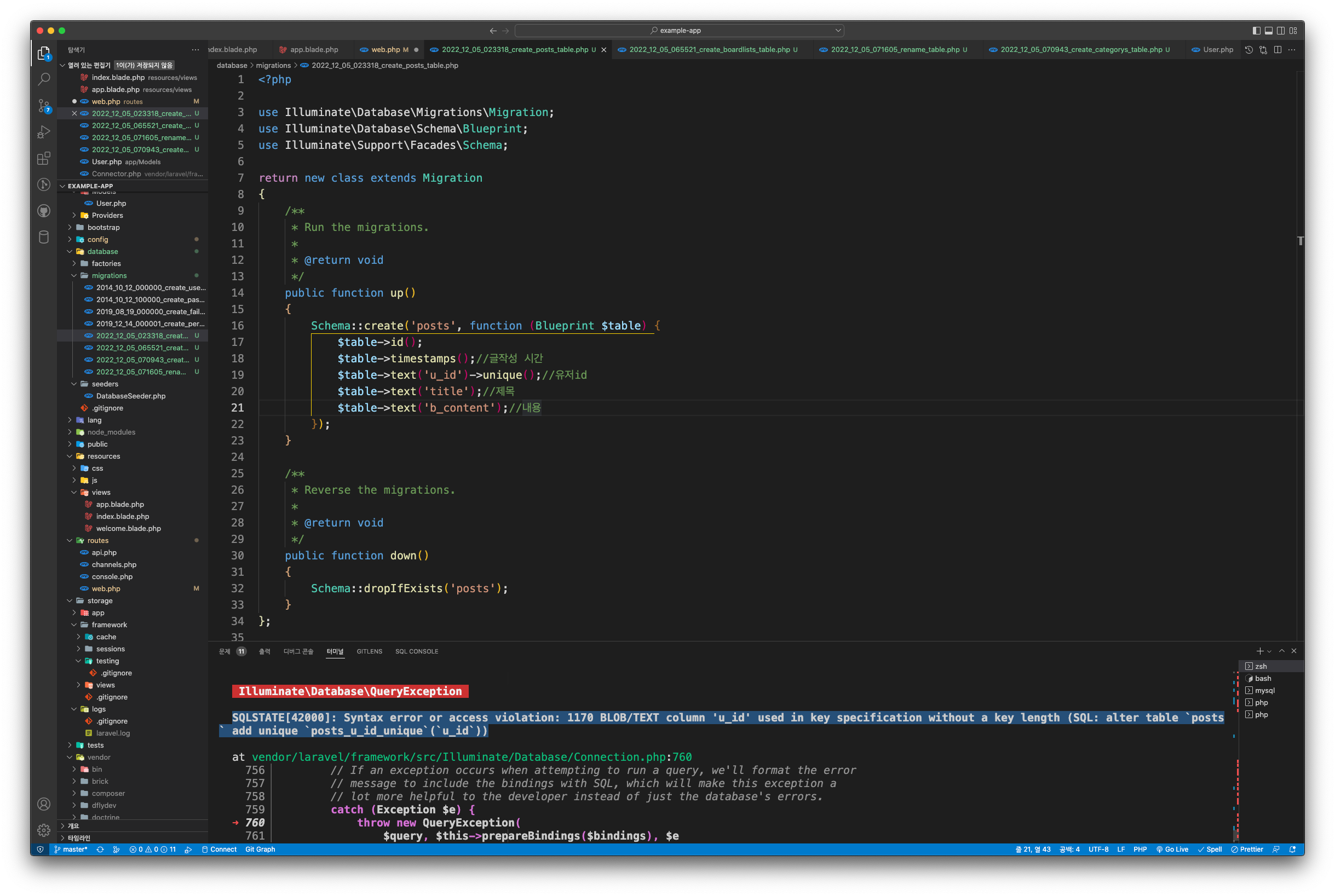 안녕하세요! 계묘년 올 한 해도 다들 목표한 바 이루시길 바랍니다. 오늘은 기본 생성 방법이 아닌 특정 디렉토리 내에 각각 모델, 컨트롤러, database를 생성하는 경로를 알려드리고자 글을 쓰게 되었습니다. 검색해도 공식문서에서도 찾지 못해 이리저리 실험하다 5시간 만에 겨우 알아냈답니다.🥲 글 쓰는 현재 기준, 맥북 Pro macOS Ventura(13.1 버전), phpstorm 사용 중입니다. 0. 본인이 생성할 곳의 위치를 먼저 알아봅시다. 데이터베이스를 제외한 모든 기본 위치는 app 하위에 존재합니다.( ex-app/Models, app/Http/Controllers) 데이터베이스만 유일하게 app과 동일한 위치에 있습니다. (ex- project/database/migrations) 하지..